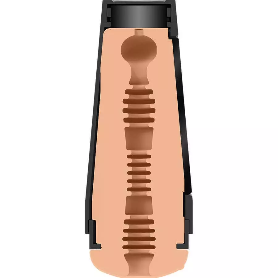 Das Case hat an der Seite zwei Druckfläschen wo du selbst bestimmen kannst wie „eng“ der Masturbator innen sich anfühlen soll.