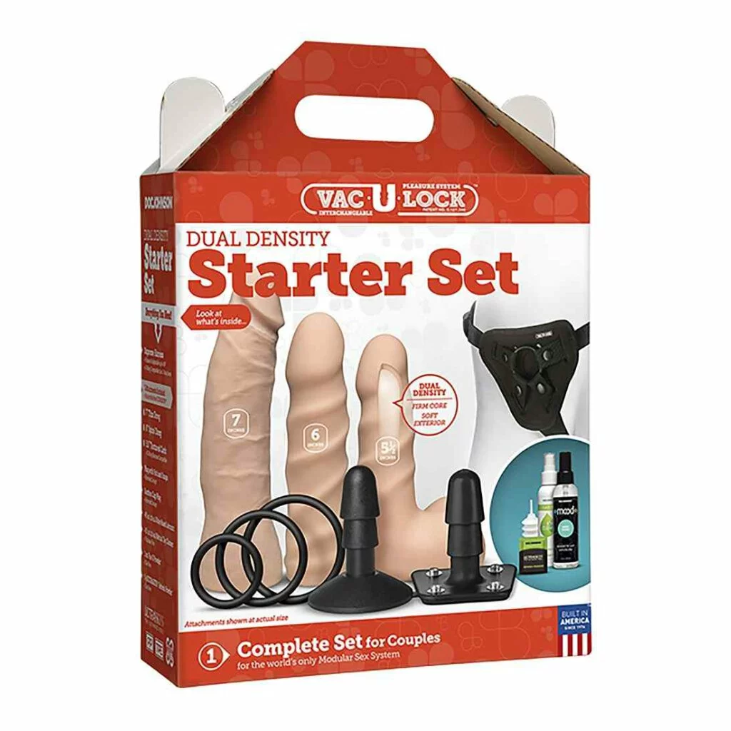 Ihr perfektes Strap-on-Erlebnis haben Sie mit Doc Johnsons Luxus-Linie von Full-Service Vac-U-Lock Gurtzeug-Sets fest im Griff. Das Vac-U-Lock Dual Density Starter Set bietet einen unterhaltsamen und innovativen Einstieg in den Strap-On-Sex mit kompletten Gurtzeug mit abnehmbaren O-Ringen und Stecker, drei mittelgroßen ULTRASKYN-Aufsätzen und einer Flasche Mood-Gleitmittel auf Wasserbasis. Diese Dual-Density-Aufsätze werden bei Verwendung auf Körpertemperatur erwärmt und zeichnen sich durch ein weiches, geschmeidiges Äußeres mit einem festen inneren Kern aus,